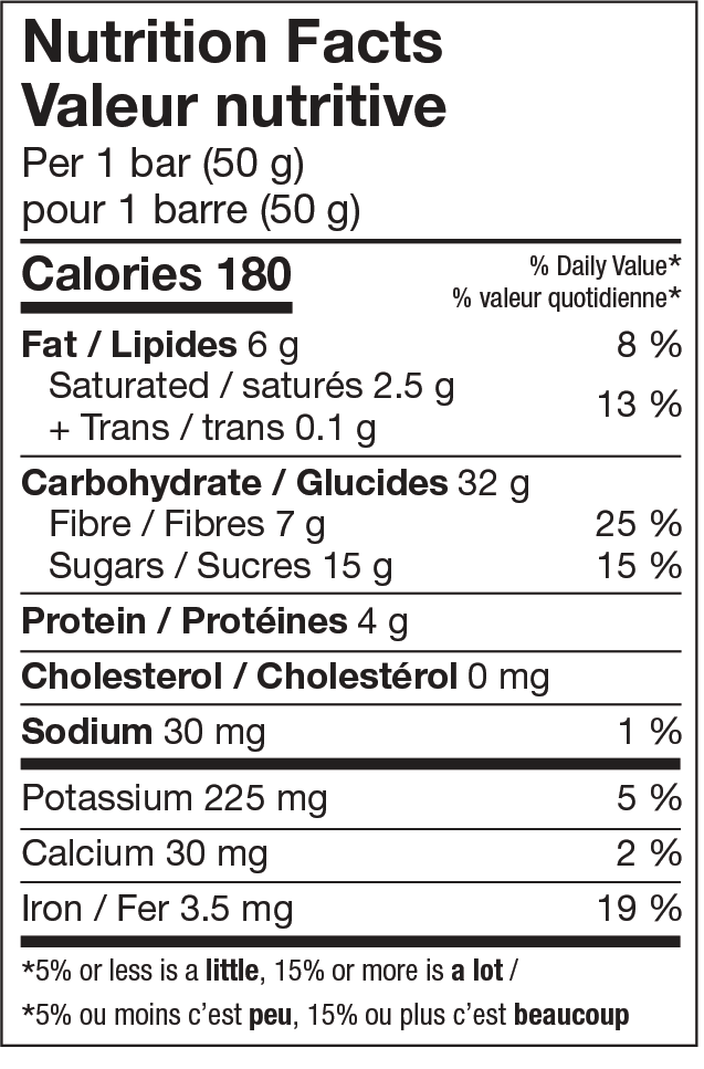 Sucres (concentré de jus de poire, sirop de datte), Farine d'avoine à grain entier, Flocon d'avoine à grain entier, Raisin (raisin, huile de tournesol), Chocolat non sucré, Cerise [cerise, Sucres (concentré de jus de pomme), huile de tournesol], Marc de pomme déshydraté,