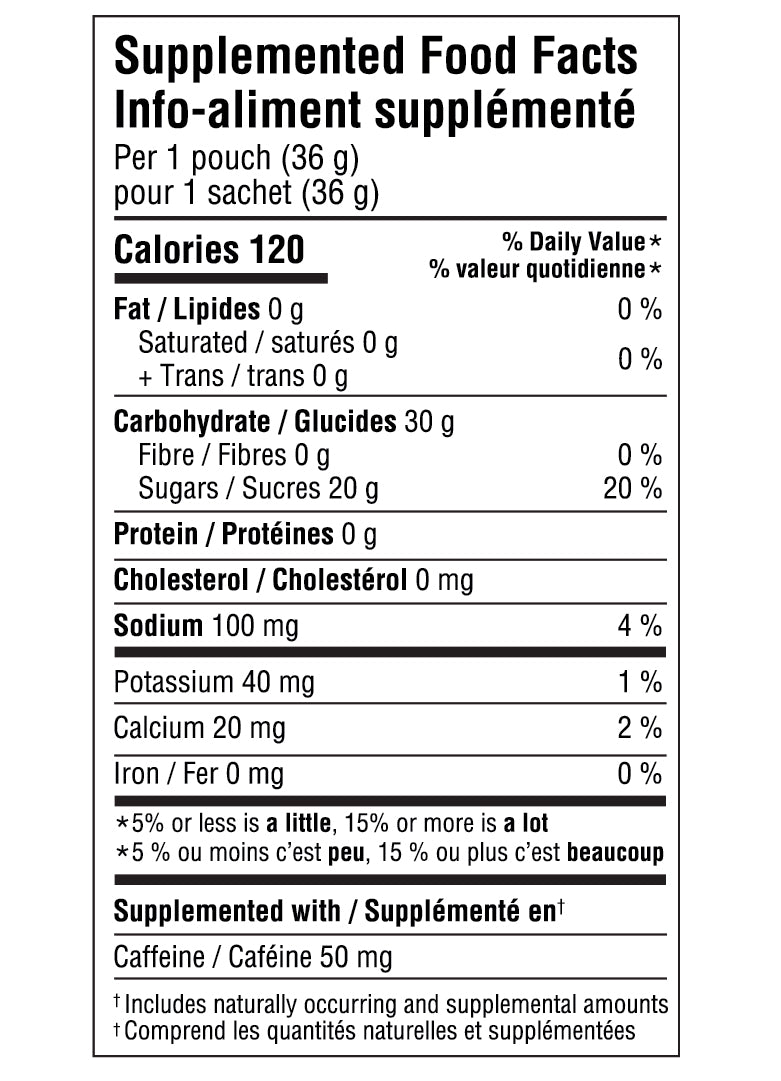 Pratique à consommer, sa texture onctueuse offre un haut pouvoir énergétique à diffusion progressive, permettant de soutenir des efforts intenses dans tous les sports d’endurance. Les gels énergétiques s’inscrivent dans la philosophie d’une alimentation naturelle, saine et performante. Ils ne contiennent aucun des principaux allergènes reconnus au Canada.
