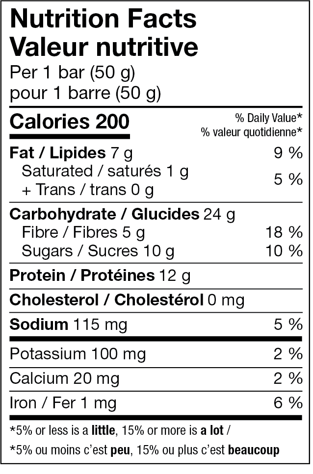 Mélange de protéines (protéine de graine de tournesol, protéine de riz), Sucres [concentré de jus de poire, sirop de datte, caramel (sucre, eau)], Graine de tournesol, Quinoa, Riz brun [riz brun, Sucres (sirop de riz brun), sel de mer], Beurre de graine de tournesol, Fibres solubles de tapioca, Eau, Huile de tournesol, Arôme naturel, Sel de mer.
